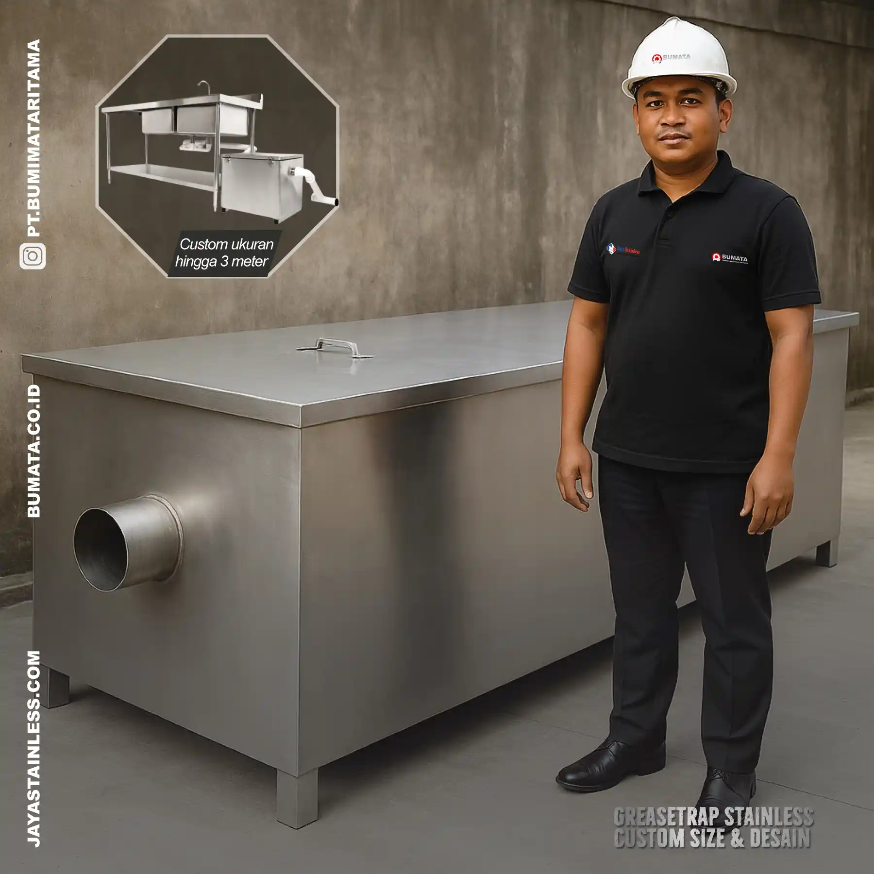 Grease trap stainless adalah alat yang berfungsi menyaring lemak, minyak, dan sisa makanan dari aliran air. Alat ini dipasang sebelum pembuangan utama agar pipa tidak tersumbat. Dengan begitu, dapur tetap bersih dan aliran air lancar.